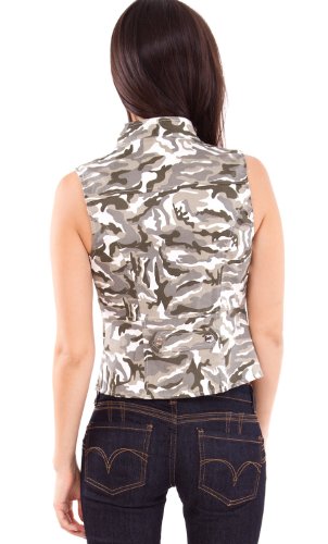 Binding : Apparel Product Description Women Sleeveless Military Top. This top features a slight collar, small front pocket detailing, a small front zipper, a camouflage print, and decorative button front lining. Approximately 19" in length, 95% Cotton, 5% Spandex. 0