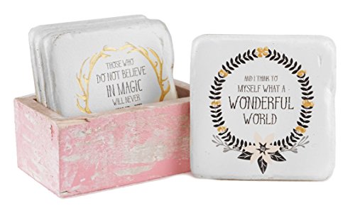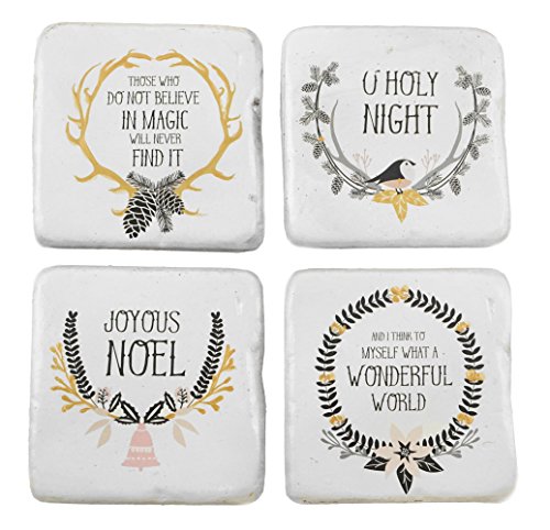 - Features a set of (4) vintage style coasters with different holiday sayings; (1) says: "Those who do not believe in magic will never find it" with an antler design, (1) says: "Joyous Noel" with a bell wreath design, (1) says: "O Holy Night" with a pinecone wreath design & (1) says: "And I think to myself what a wonderful world" with a holly wreath design