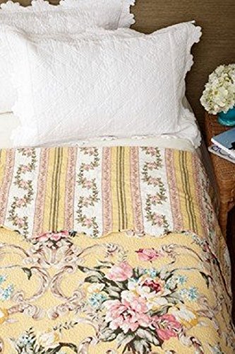 Product Description Intricate quilt, yellow base with vermicelli quilting, rose vines throughout, very intricate design, reverses to stripe. Will add design to any room. 0