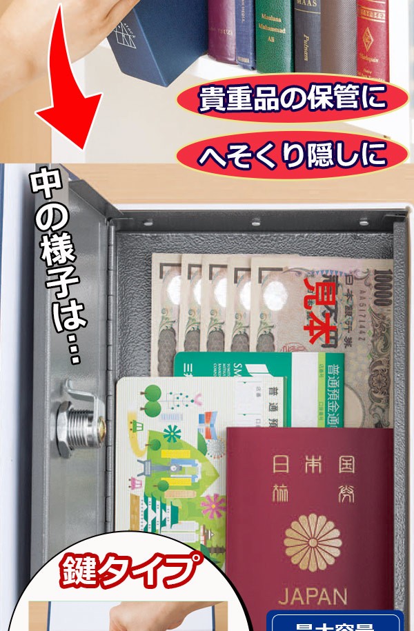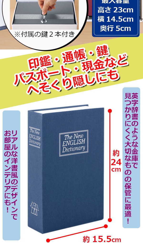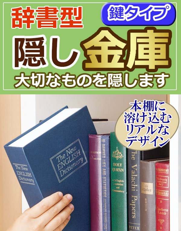 | 貴重品や誰にも知られたくないへそくりの保管に!辞書型の隠し金庫で大切なものを守ります。リアルな洋書風のデザインで本棚にしまえば見つかりにくく、インテリアにも最適!付属の鍵で開閉できるから安心です! |
