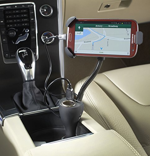-. Feature : View, talk, charge and listen hands-free while you drive, with a versatile 2A charger and car cell phone holder that plugs into any 12V power socket / 3 power outlets charge smartphones, iPhones, tablets, cameras and handheld gaming stations / Adjustable, 360 degree rotate and pivot cell phone mount with non-slip grips and gooseneck stand positions the phone where you need it / The Charg'nRide mobile phone charger and stand gives you 3 chargers in one plug-in port - a 12V DC charger and 2 USB ports - so you and a passenger can charge while you drive / Fits iPhones and android phones up to 3" wide and 5" high, micro USB cable included