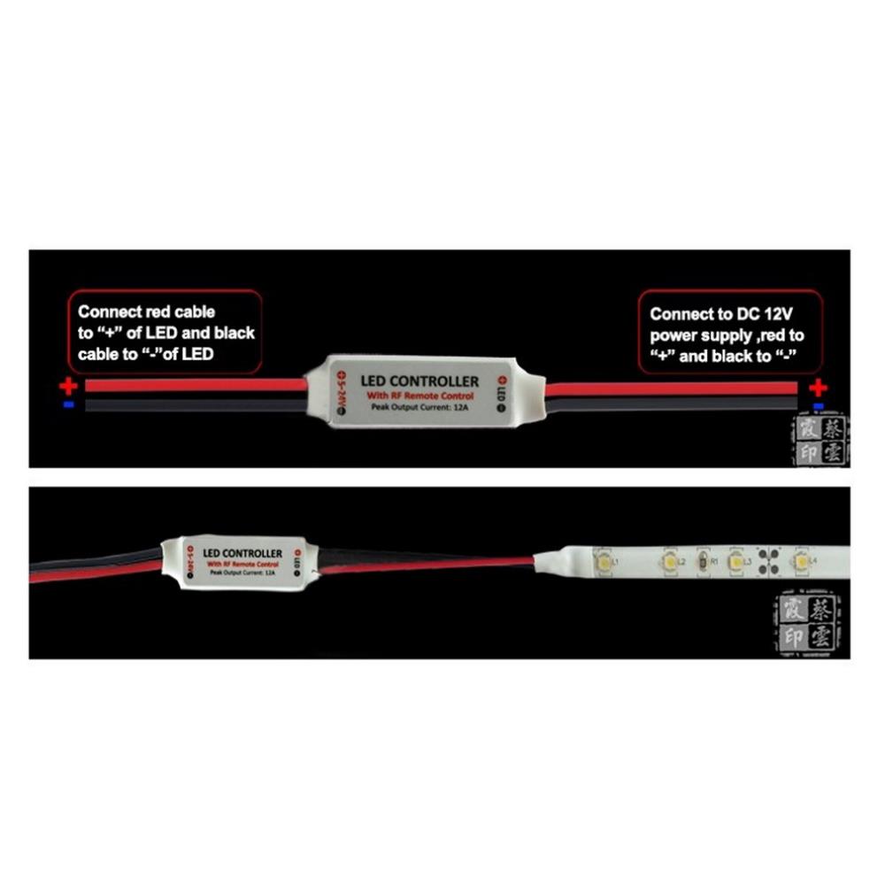 | Instructions for RF Wireless Remote 1.Turn On/ Standby Press this key to turn on unit or switch to standby mode. Unit will turn on and restore to previous status at powering on moment. 2. Lighting mode Switch to lighting mode from dynamic mode. 3/8/9. Dimmer Adjust Shortcuts Switch to 100% 50% or 25% brightness lighting mode. 4/6. Dynamic Mode Adjust Switch to dynamic mode from lighting mode or switch between different dynamic modes. 5/7. Speed Adjust Adjust playing speed of dynamic modes. Press SPEED+ to increase seed and press SPEED- to decrease. 10/11. Brightness Adjust (Dimmer) Adjust lighting mode brightness. Press BRIGHT+ to increase brightness and press BRIGHT- to decrease Functions for RF Wireless Remote Dimmer !#!amp!*! Dynamic 8 Dynamic Effects 10-level Dimmer 256-Grade PWM Speed Adjustable Card Type Remote Ultra Slim Design Smooth Dimmer Effect 1 to 1 Remote Paired Auto Save Function Installing for RF Wireless Remote 1. Power Supply This unit accepts DC 5V to 24V power supply. The red cable should be connected to positive and black cable to negative. Please select proper power supply according to the LED application. 2. LED Output The red cable should be connected to LED positive and black cable to negative. The peak output current is 12A please reduce load if main unit is overheating. CAUTION:Do not short circuit the LED output this maylead to permanent damage! 3. Remote Control Please pull out the insulate part before using. The RF wireless remote signal can pass through barrier so it's not necessary to aim at the main unit when operate. For proper receiving remote signal do not install the main unit in closed metal parts. The remote battery is 3V CR2025 type please only replace with same type battery. Specification Dynamic mode:8 modes Dynamic speed level:10 levels Lighting brightness level : 10 levels PWM grade:256 grades Smooth dimmer effect: Yes Working voltage:DC 5~24V Output current :peak 12A Remote control mode:RF Wireless Remote frequency:433.92MHz Remote distance :!#!gt!*!15m at open area Package includes: 1 xMini In-line LED Light Controller/Dimmer 1 x RF Wireless Remote Controller R106 |