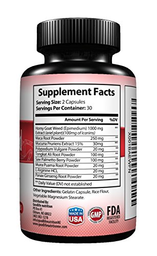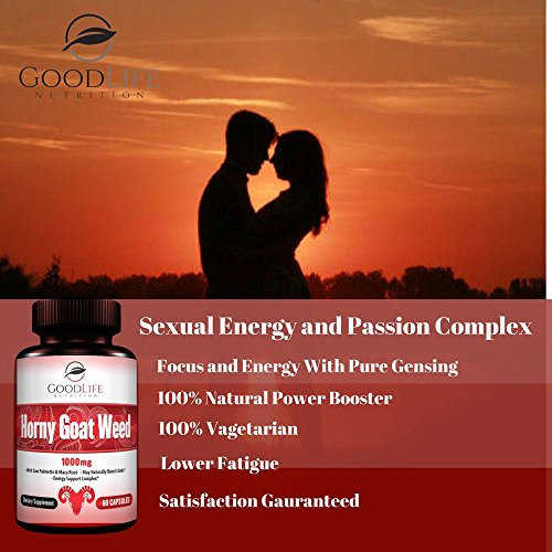 •GoodLife NutritionTM a new leader in all natural vitamins and supplements is proud to offer you our exclusive Horny Goat Weed herbal supplement. This delicate blend of pure horny goat weed, ginseng, maca root, and Tribulus terrestris is guaranteed to,aid focus, and decreasing daily fatigue. The herbal and botanical blend of proven all natural ingredients in our horny goat Weed also helps to promote cardiovascular health and increased blood flow helping you stay active, alert, and ready for anything life might throw your way. Stop going through life lacking energy and sex drive and take back your youthful vigor safely and naturally with this amazing natural remedy by GoodLife NutritionTM.