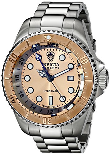 -. Feature : Date window at 3:00; invicta reserve 5-year warranty included with shipment / Rose gold dial with silver border, black, blue and white hands, black and white hour markers; luminous; unidirectional stainless steel bezel with rose gold top ring; screw-down crown; GMT ; hydromax; flame fusion crystal; stainless steel case and bracelet / Swiss-quartz movement / Case diameter: 54mm / Water resistant to 984 feet