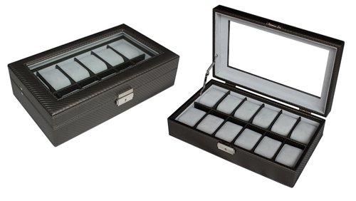 -. Binding : Watch -. Brand : TimelyBuys -. EAN : 0610395277330 -. Feature : Beautiful carbon fiber pattern in gorgeous pewter color; Ideal for men or women / Tastefully protects, stores, and organizes up to 12 watches; Each compartment measures 45 mm in width; (3.25" L x 1.75" W) / Detailed stitching and attractive faux suede lining add a luxury feel; Also available in cream, black and brown leatherette as well as cherry and ebony wood tones / Unique, one-level design offers maximum clearance for large watches / Case measures approximately 7 1/2" L x 12 1/2" W x 3" H -. Label : TimelyBuys -. Manufacturer : TimelyBuys -. Model : 12 CAR -. MPN : 12 CAR -. PackageQuantity : 1 -. PartNumber : 12 CAR -. ProductGroup : Watch -. ProductTypeName : WATCH -. Publisher : TimelyBuys -. Studio : TimelyBuys -. Title : 12 Piece Pewter Carbon Fiber Watch Display Case Men's or Ladies Watch Box Jewelry Glass Top -. UPC : 610395277330