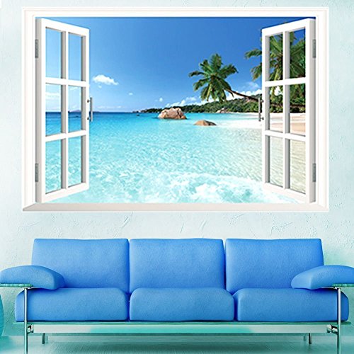 -. Title : Amaonm® New Design Removable Huge Large 3D Beach Sea Window View Art Decor Wallpaper Mural Wall Decals Sticker for Home Wall Art Decor Kids Bedroom Living Room Decorations