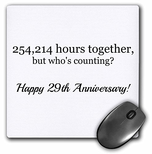 -. Binding : Office Product -. Brand : 3dRose -. EAN : 0190133318339 -. Feature : Dimensions (in inches): 8 W x 8 H x 0.25 D / Matte finish / Soft to touch, will not crack or peel / Clean with mild detergent / Made of heavy-duty recycled rubber -. Label : 3D Rose (Home Improvement) -. Manufacturer : 3D Rose (Home Improvement) -. Model : mp_224674_1 -. MPN : mp_224674_1 -. NumberOfItems : 1 -. PackageQuantity : 1 -. PartNumber : mp_224674_1 -. ProductGroup : Office Product -. ProductTypeName : OFFICE_PRODUCTS -. Publisher : 3D Rose (Home Improvement) -. Studio : 3D Rose (Home Improvement) -. Title : Happy 29th Anniversary - 254214 hours together - Mouse Pad, 8 by 8 inches (mp_224674_1) -. UPC : 190133318339