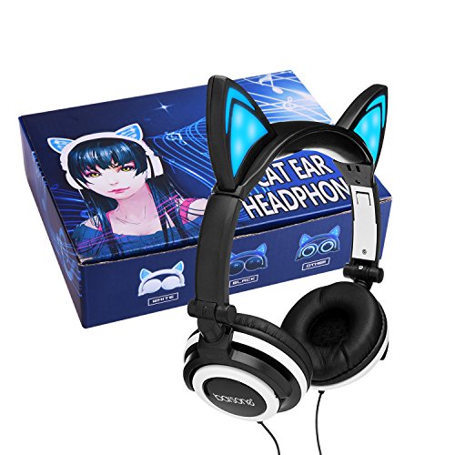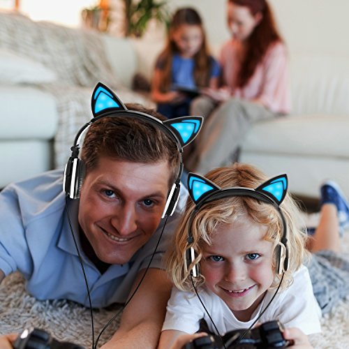 Fashion and Cute Headphone: Cute led cats ears flashing when they light up,using a On/OFF light button on the back of left ear,powered by a free replaced battery. Very creative adjust over ear cushioning headband design for passive noise reduction and a secure fit,fully covering your ears and do a pretty good job dampening outside sounds