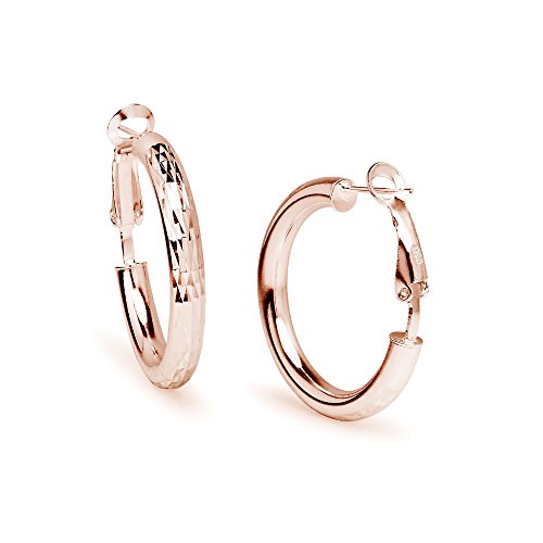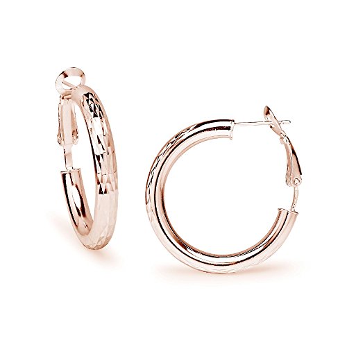 These attractive clutchless hoop earrings feature a rose gold flashed sterling silver diamond cut design. They are 4mm thick and are 30mm in diameter.Feature