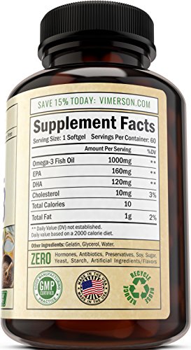 Vimerson Health's Fish Oil Omega-3 is RICH WITH EICOSAPENTAENOIC ACID, or EPA, an omega-3 fatty acid found in fish that is a precursor to chemicals involved in blood clotting and inflammation. Each capsule is also ABUNDANT WITH DOCOSAHEXAENOIC ACID, another omega-3 fatty acid that is a major component of the human retina, sperm, and cerebral cortex. Its UNIQUE FORMULA also includes 100% PURE SEA-HARVESTED PELAGIC FISH OIL. Our Fish Oil Omega-3 is a natural supplement that is safe, effective, and HELPFUL IN BOOSTING ONE'S OVERALL HEALTH. It AIDS IN PROMOTING CARDIOVASCULAR HEALTH as well as ENHANCING BRAIN POWER AND MEMORY. EPA and DHA, two fatty acids found in fish oil, also aid in preventing weakening of the brain, especially in older adults. They help ward off a plethora of cardiovascular diseases as well. These softgels with fish oil omega-3 also ASSIST IN PROMOTING NORMAL BLOOD PRESSURE, as well as STRENGTHENING THE IMMUNE AND NERVOUS SYSTEMS. Plus, they PROMOTE HEALTHY JOINTS, EYES, SKIN, HAIR and more, for a healthy mind and body.