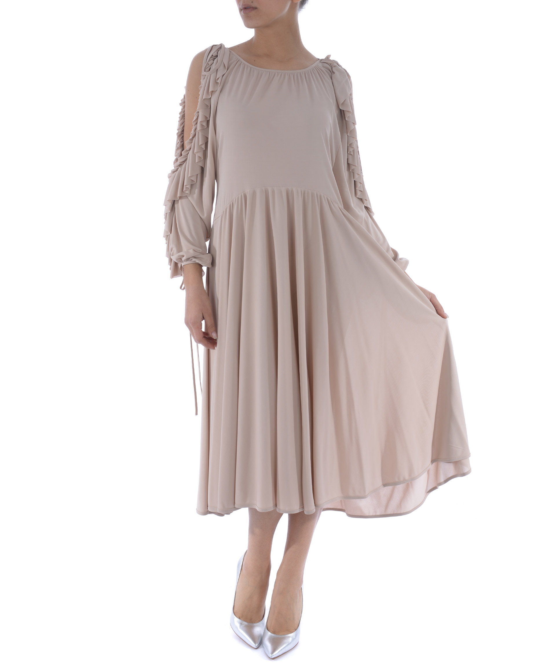 Abito longuette Philosophy di Lorenzo Serafini in viscosa leggera Rosa antico. Scollo rotondo. Manica lunga con aperture e ruches. Polsi con lacci da annodare. Taglio in vita. Sfoderato. Misura in foto 40 100% viscosa