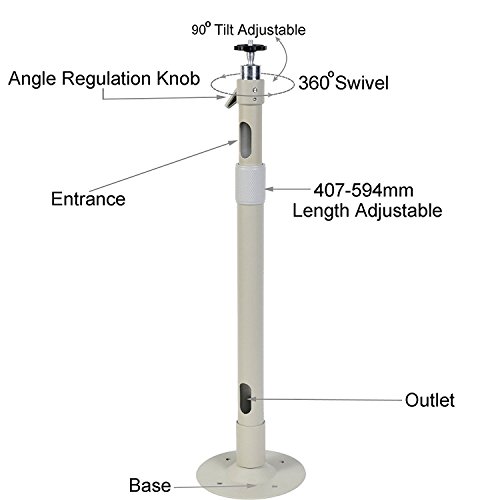 -. Feature : Ceiling mount bracket stand for security camera / Adjustable length from 16-23 3/8 inch / Tilt 90 degrees, swivel 360 degrees / Aluminum alloy construction, light weight, heavy duty. Loading capacity 8 lb / Cable management through extension pole
