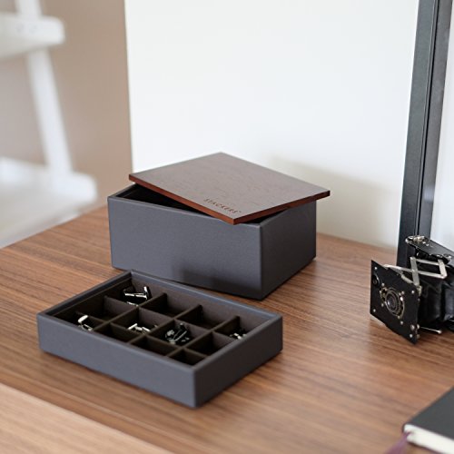 -. Binding : Kitchen -. Brand : Stackers by LC Designs -. Color : Charcoal Grey -. EAN : 5013648037883 -. Feature : Stackers: Suitable to store most types of mens's accessories; including rings, cufflinks, watch straps and bracelets / Stackers: Features a contemporary wood style lid / STACKERS: Combine this with the mini watch box for extra storage space / STACKERS: Ideal as a drawer, desk or bedside table organizer / STACKERS: Men's Mini Cufflink Section 7.1 x 4.9 x 1.4 inches -. IsAutographed : 0 -. Label : Carters of London -. Manufacturer : Carters of London -. Model : 73642 -. MPN : 73642 -. PackageQuantity : 1 -. PartNumber : 73642 -. ProductGroup : Home -. ProductTypeName : HOME -. Publisher : Carters of London -. Size : 7.1 x 4.9 x 1.4 inches -. Studio : Carters of London -. Title : STACKERS mens accessories | mini charcoal grey cufflink box stacker with wood style lid