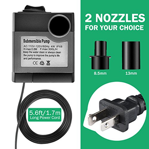 - Multifunction & Two Nozzles. This submersible pump is designed for small to medium size aquarium, tabletop fountains, water gardens and hydroponic systems. Equipped with two nozzles, one is 8.5mm diameters, the other is 13mm, providing different water flow effects