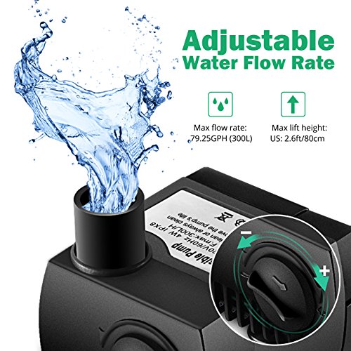Homasy 80 GPH (300L/H, 4W) Submersible Water Pump, Ultra Quiet For Pond, Aquarium, Fish Tank Fountain, Powerful Water Pump with 5.9ft (1.8m) Power Cord