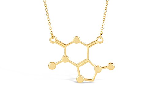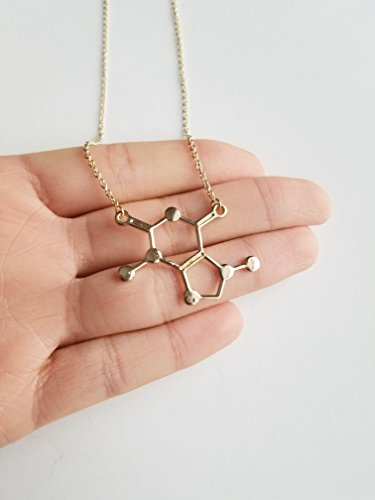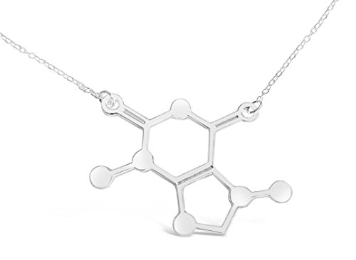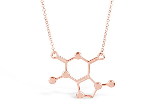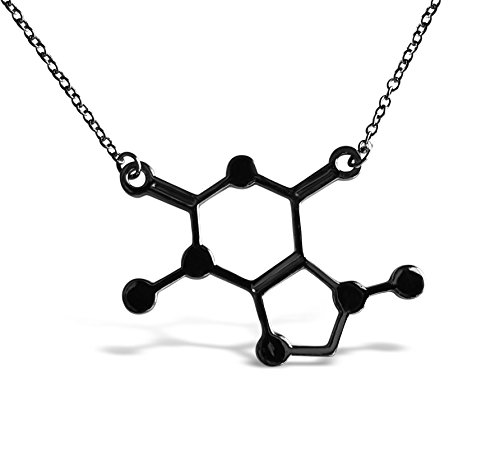 Frequently find yourself saying, "I love chemistry" or "I love coffee"? If so, start accessorizing with our silver, rose gold, carbon black or gold tone caffeine molecule necklace. This necklace has a pendant of caffeine's molecular structure, making it a unique way to display your love for chemistry, coffee, energy drinks, or soda. It's attached to a like-colored colored, 17-inch chain with a secure lobster clasp closure.