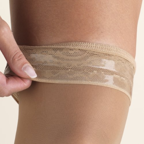 - Feature : Therapeutic graduated compression / Mild support to help reduce leg fatigue and slight ankle, leg, and foot swelling / Fashionable sheer fabric and heel / Attractive silicone lace stay-up top for all-day comfort / Fit by shoe size