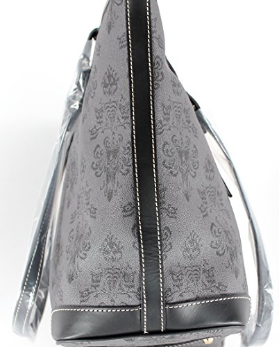Studio : Dooney Bourke Publisher : Dooney Bourke Product Description Created especially for Walt Disney World Resort and Disneyland Resort - Screen print featuring Haunted Mansion wallpaper design - Leather trim - Zip top closure with leather pull - Interior zip pocket with leather pull - Two interior compartments, one with leather tab and snap fastener - Cell phone pocket - Interior strap with key clasp - Leather Haunted Mansion tag - Golden hardware - Fully lined in purple - Metal feet - 'Dooney Bourke' metal label on front - Inspired by Disney's classic The Haunted Mansion attraction - Coated Cotton / Leather / Metal - 12' H x 14' W x 6.5' D 0