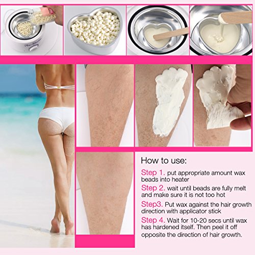 How to use:1. Pour beads into our HoBeauty wax warmer. Within 20 minutes, wax should be warm and creamy like yogurt.(To have a better hair removal, please KEEP MELTED WAX TEMPERATURE ABOUT 42?C/107?F. If the temperature of melted wax is lower than 42?C/107?F, it can NOT remove hair. ) 2. Test temperature of wax on the inside of your wrist with spatula. 3. Prepare the area to be waxed with lotion, or wash the area of skin to waxed with 104℉ water. Massage one drop of pre depilatory oil. Blot with tissue to remove excess oil from skin. 4. Using a wooden disposable wax applicator stick, take a quarter sized amount of wax, smooth the underside of the spatula against the tin, turn spatula evenly for several rotations to less dripping. 5. Deposit wax onto skin using edge of spatula and spread. APPLY PRESSURE IN THE DIRECTON OF HAIR GROWHT. The narrow section of wax should be applied thinly and evenly with an edge around the perimeter for easy wax removal. 6. Lift the ridge and remove the wax parallel and close to the skin in the OPPSITE DIRECTION OF HAIR GROWTH . Be sure to allow time to let wax set before removal 7. Apply perron rigot after wax gel and/or moisturizing lotion for a cooling, soothing, and hydrating finish. Warnings: 1.Put the wax against the hair growht direction.? 2. Pre/Po-wax put some oil or lotion over skin ? 3? Smell: when wax is melting, natural resin smell will come out, not quality problem at all? 4.Some wax beads will stick to each other because of heat, which won't affect proper function. 5.This product is uneatable. Keep it away from children 6.stored at cool, dry and ventilated place?