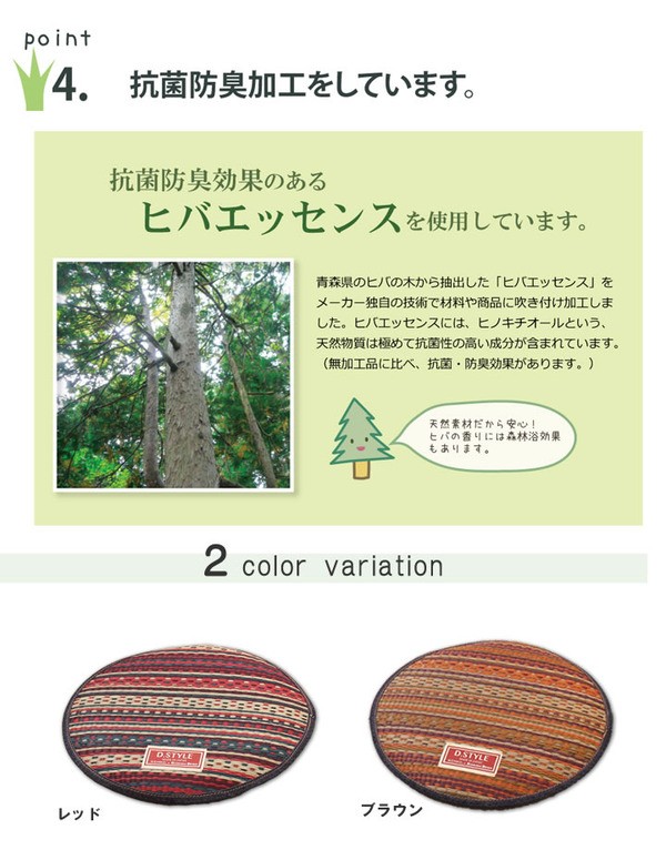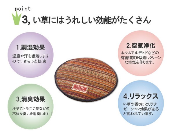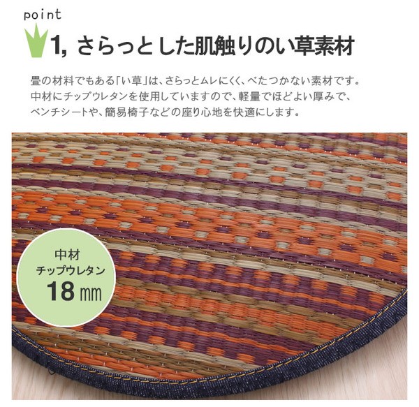 裏地、ヘリ部分に国産デニム生地を使用したチェアパッドです。インテリア商材なのでデニム生地には色落ちをしにくい加工を施しています。表生地には国産(九州産)のイ草を使用しています。国産イ草は一本一本が太く、表皮が厚く繊維がキメ細かいので弾力性があり、耐久性に優れています。その他イ草の効能として1.綿の約2.5倍の吸湿力 2.汗のにおいを軽減。汗のにおいの元となる化学物質を90%以上抑えます。などがあります。中材にはチップウレタンを使用しています。柔らかすぎずヘタリにくく、型崩れしにくいのが特長です。フローリングでのご使用にも適しています。い草の表面に天然青森ヒバ加工を施しています(抗菌・防臭効果)。青森県のヒバの木から抽出した「ヒバ油」をメーカー独自の技術で材料や商品に加工しました。「ヒバ油」には、ヒノキチオールという天然物質としては極めて抗菌性の高い成分が含まれ、医療や食品など多分野で利用研究が進められています。※自然素材であること、また職人が一つ一つ手作業にて加工を行うため、形状のバラつきや表示サイズと多少異なることあります。ご了承下さい。