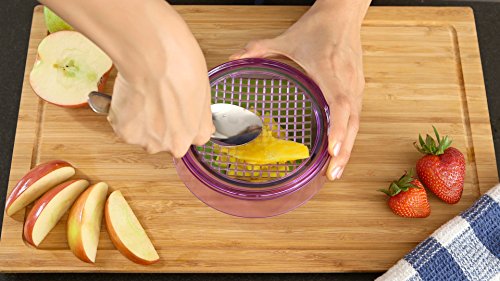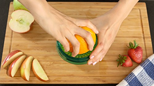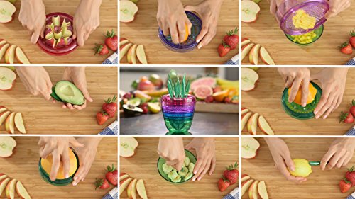 -. Feature : Slice and core apples or pears. Cut kiwi and strawberries / Helps to peel oranges and other citrus fruits. Scoop avocados and kiwis / Mash bananas and other soft fruits. Grate ginger and citrus peels / Squeeze lemons and limes. Squeeze oranges and grapefruits / Serve and enjoy your creations with the bowl and picks. Stand up display on kitchen counter