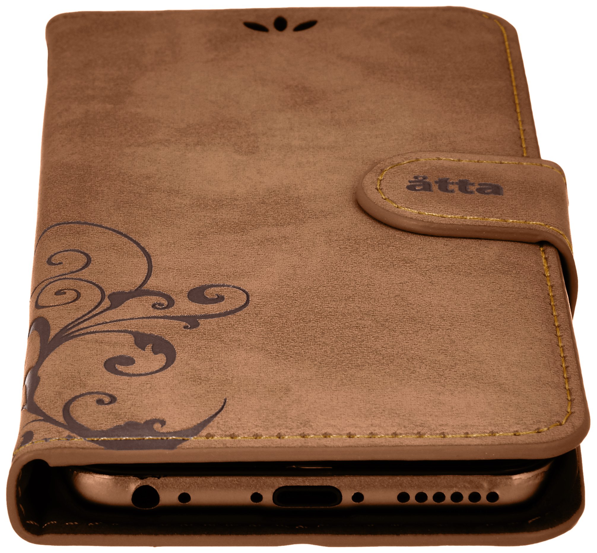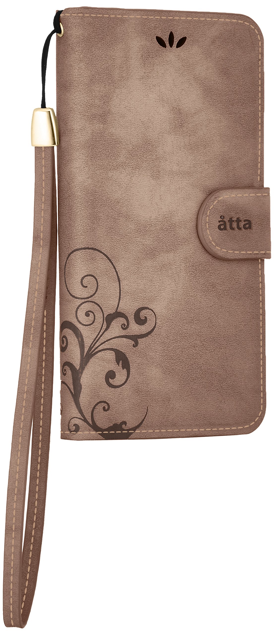 Stand function, magnetic button, 3-way card pocket with hand strap.