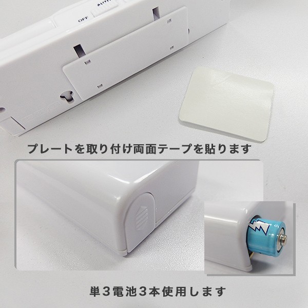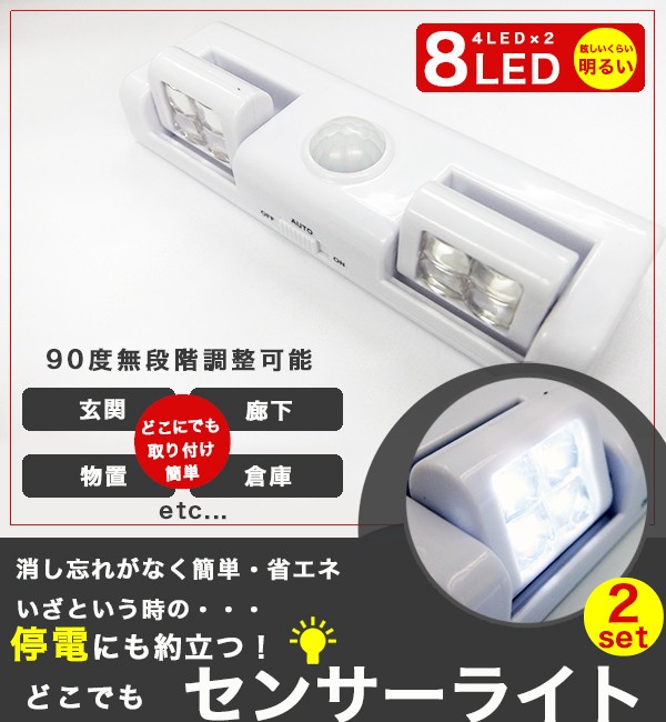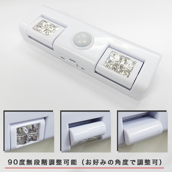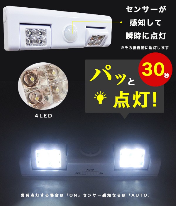 | 商品説明 | センサー感知で動きに反応してLEDがパッと点灯 玄関先、ガレージ、ベランダ、廊下、お部屋など場所を選ばずどこでも設置可能 LEDなので熱を持たず火災の心配ありません センサー感知で自動点灯&自動オフ 左右のライトは独立していて角度を90度内で無段階調整可動 コンセント不要!コードレスで使える乾電池式 フック穴・両面テープで取り付けが可能 サイズ(約):16.2×5.2×2.3cm 重さ(約):84g 材質:ABS、PE センサー有効範囲(約):角度/90度 距離/1~2mまで 点灯時間(約):25秒 電源:単3形電池×3本 ※電池をセットした時、明るい場所でも点灯する場合があります。 一度消灯しますとその後、真っ暗な場所でのみセンサーが反応します。その場合商品不良ではありません |