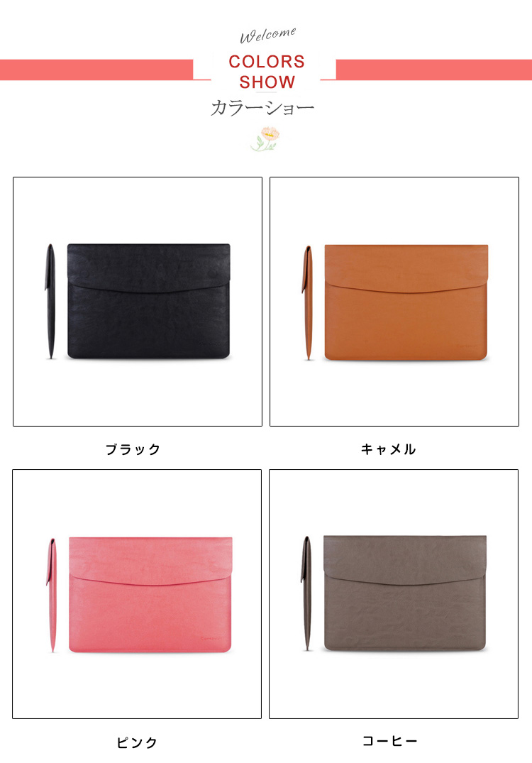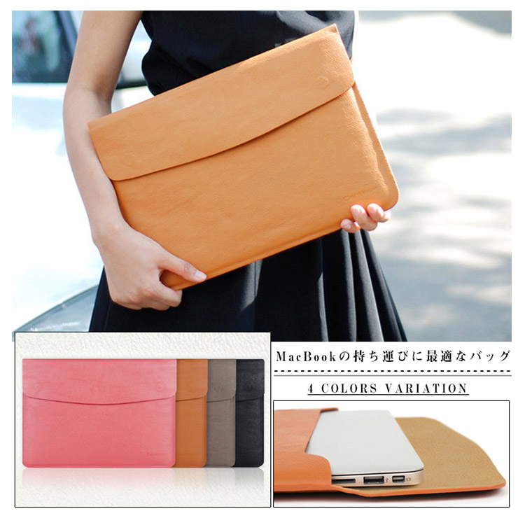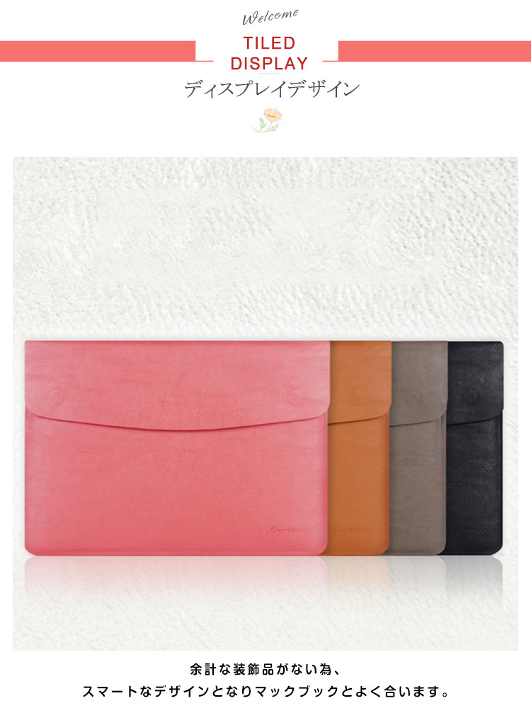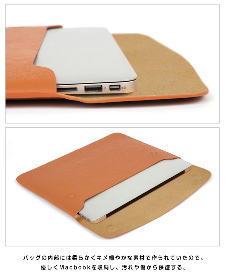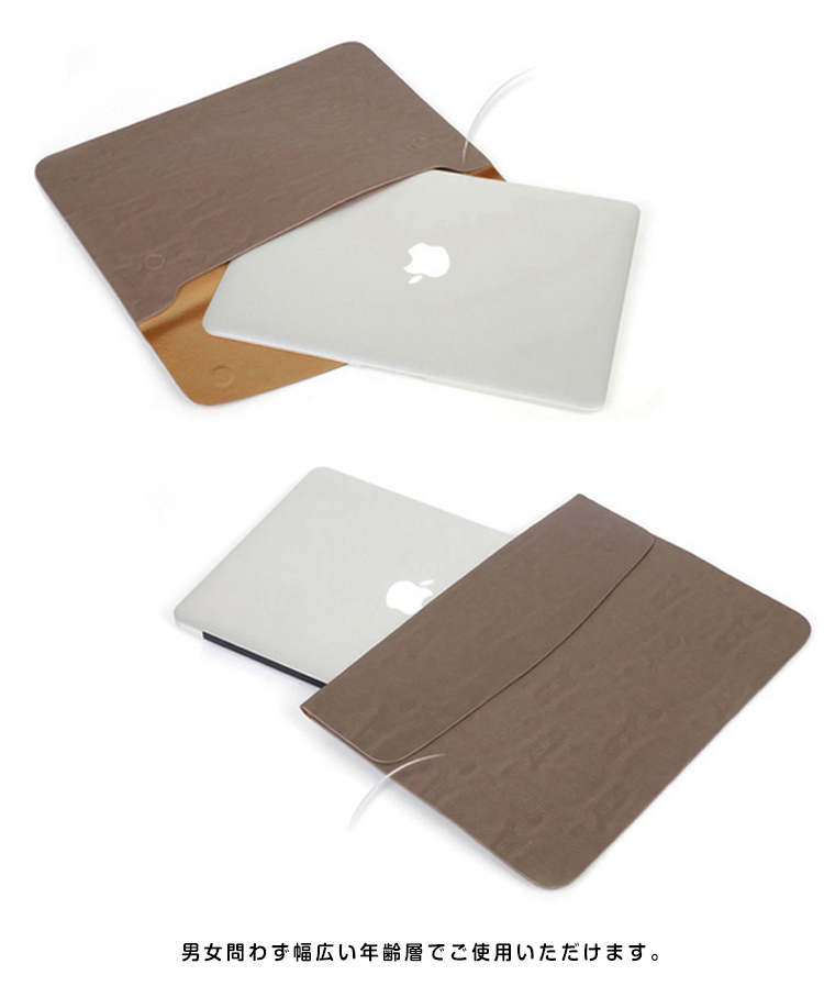 | MacBookの持ち運びに最適なバッグ。 オシャレなパソコンインナーケース。内部に磁石が内蔵されており、開け閉めがとっても簡単です。余計な装飾品がない為、スマートなデザインとなりマックブックとよく合います。男女問わず幅広い年齢層でご使用いただけます。 | |