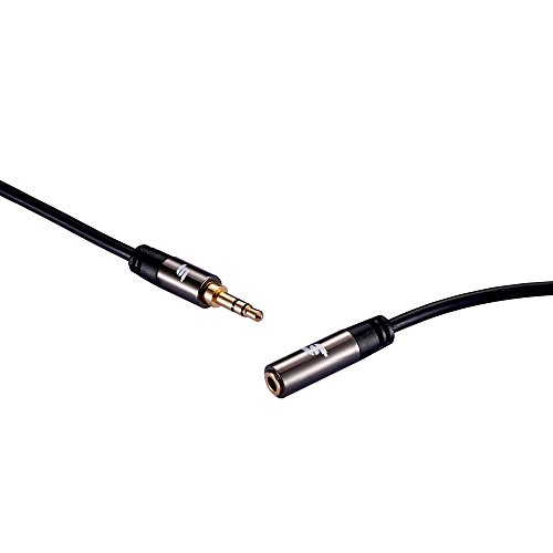 3.5mm male-to-female stereo audio cable transmits audio in stereo format.