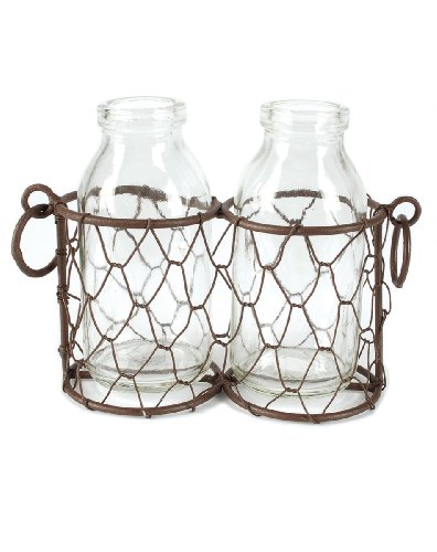 Blossom Bucket 141-70529 Rustic Double Glass Bottles with Wire Holder, 4-1/2"
