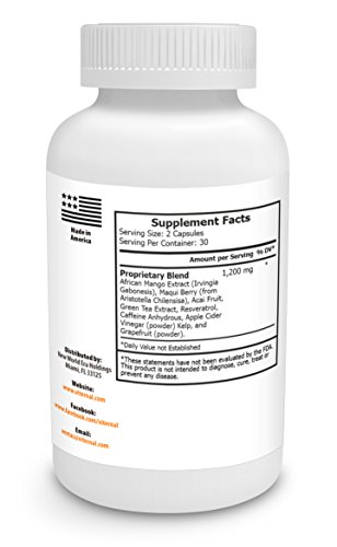 -. Binding : Health and Beauty -. Brand : Viternal -. Feature : Buy 3 and Get 1 Free(Add 3 to your Shopping cart and pay for only 2 )!! Our mission is to help our customer transform their lives promoting a healthy lifestyle. Clinical studies determined people who take 150 milligrams of Irvingia Gabonensis (African Mango Extract)twice a day lose an average of 5 to 10 pounds within 30 days. / Clinical trials sest that Irvingia Gabonensis may promote weight loss.*We recommend a low calorie diet and regular exercise, Viternal Arican Mango Extract is a great, non-stimulating supplement to your overall weight-loss goals. / Viternal's Weight Loss Supplement is made in the USA in a FDA certified Lab with the highest quality and all products are made according to strict GMP standards / Certified purity and quality. Viternal African Mango is manufactured in the USA in an NSF/GMP certified Lab, your purchase meets strict standards for ingredient quality and safety. All natural, non-stimulating, and gluten-free / Viternal Products has transformed the lives of many, we have real testimonial from men and women around the world. Join our mission today! ADD 3 ITEMS TO CART AND PAY FOR 2 -. IsAdultProduct : 0 -. Label : Viternal -. LegalDisclaimer : * This statements has not been evaluated by the Food and Drug Administration. This product is not intended to diagnose, treat, cure, or prevent any disease. -. Manufacturer : Viternal -. MPN : AFRIMAN914 -. PartNumber : AFRIMAN914 -. ProductGroup : Health and Beauty -. ProductTypeName : HEALTH_PERSONAL_CARE -. Publisher : Viternal -. Size : 60 Capsules -. Studio : Viternal -. Title : Viternal African Mango Extract |Irvingia Gabonensis,Pure 1200mg 60 Capsules. Buy 3 and Get 1 Free