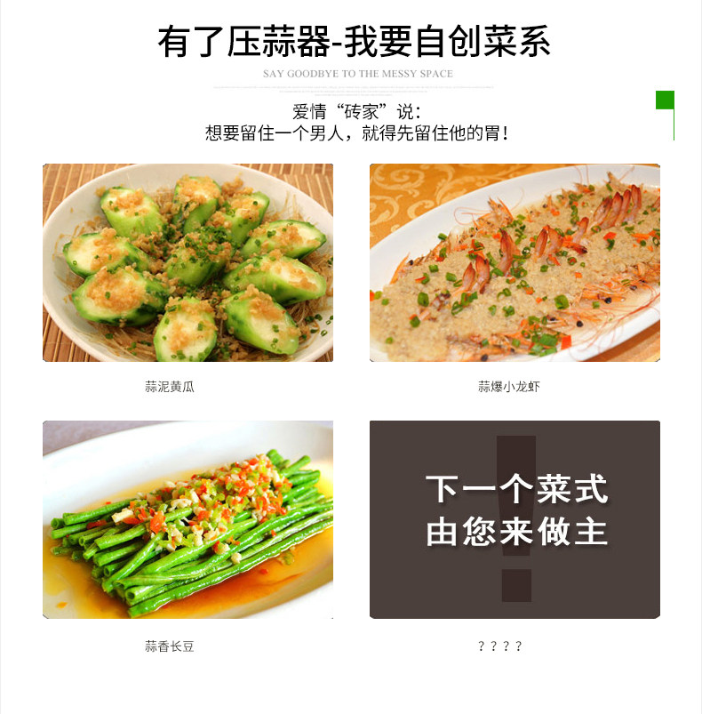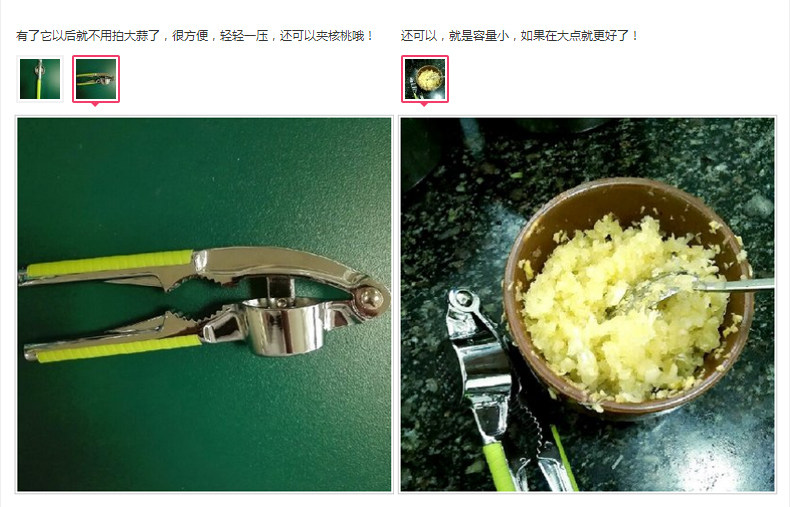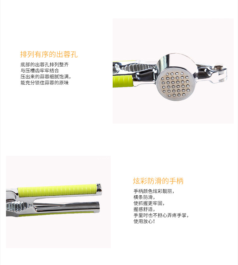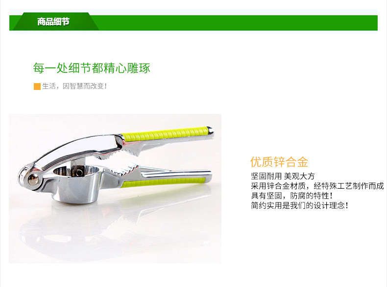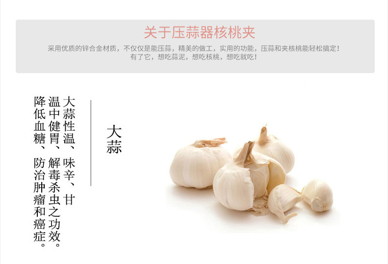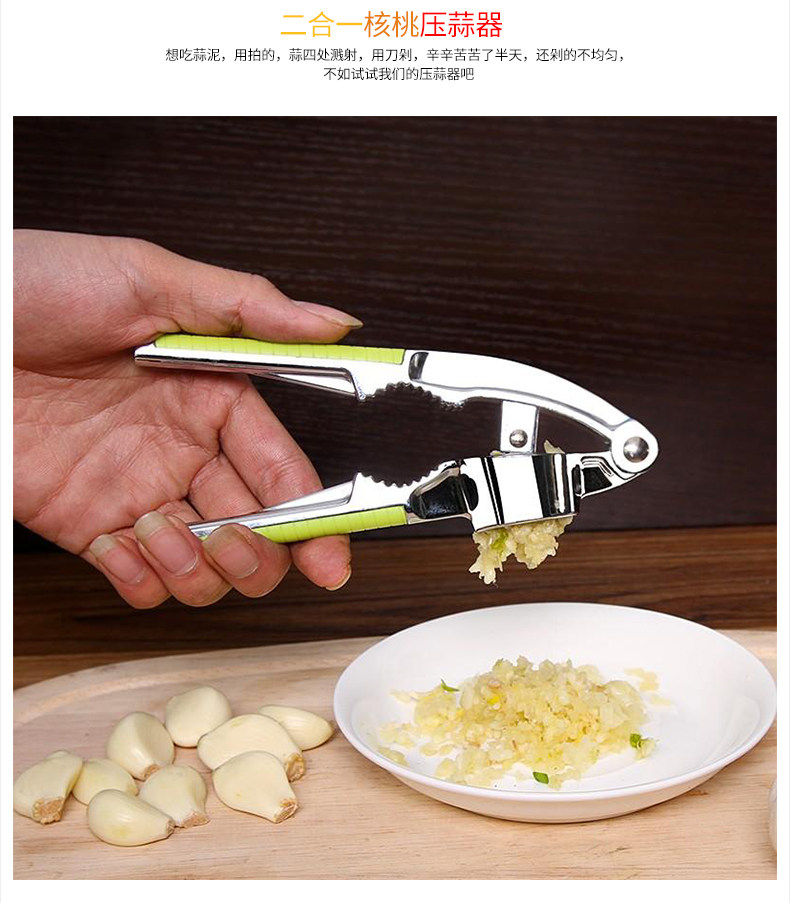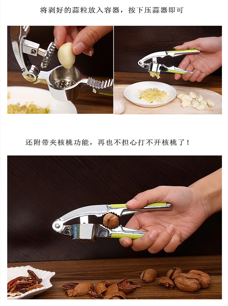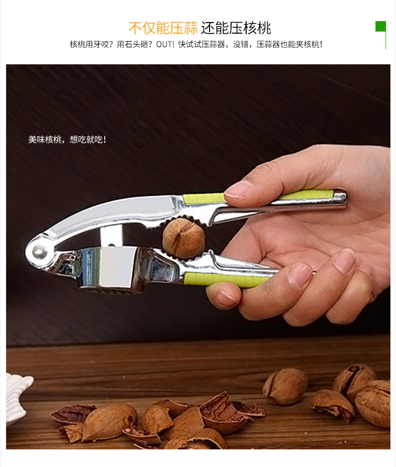 采用优质的锌合金打造,二合一多功能设计,产品不仅能压蒜泥,而且还能压核桃!