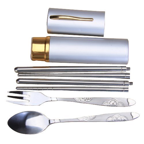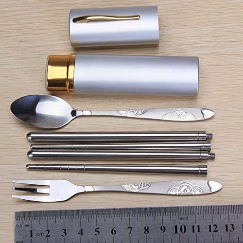 -. Feature : 3-in-1 fork, spoon, chopsticks and foldable / In a nice pen aluminum housing for camping, traveling, outdoor activities or lunch / Chopsticks with screw for easy entry and unfolding / Fork and spoon handle with non-slip pattern design pendant / Deployed sticks length: approx. 9 inches/ 22.5 cm