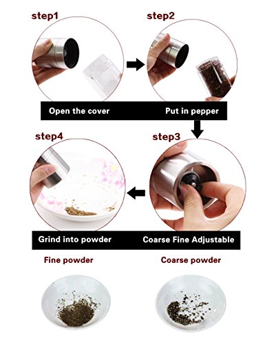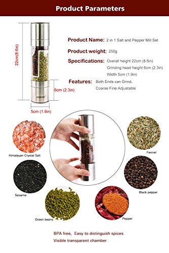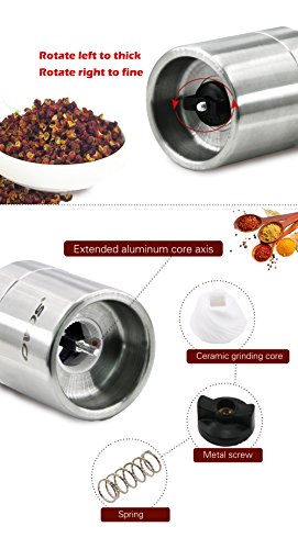 ✓STRONG AND EASY TO USE - With a body made of Brushed Stainless Steel and an Acrylic chamber the 2 in 1 salt & pepper grinder is durable and strong with no glass breakages and high quality ceramic rotor mechanism to grind the salt and pepper. With marked chambers for salt and pepper and a screw off top, refilling is a breeze.