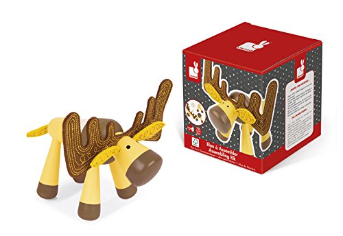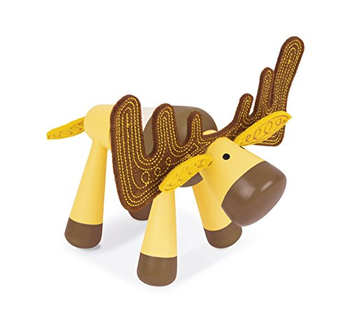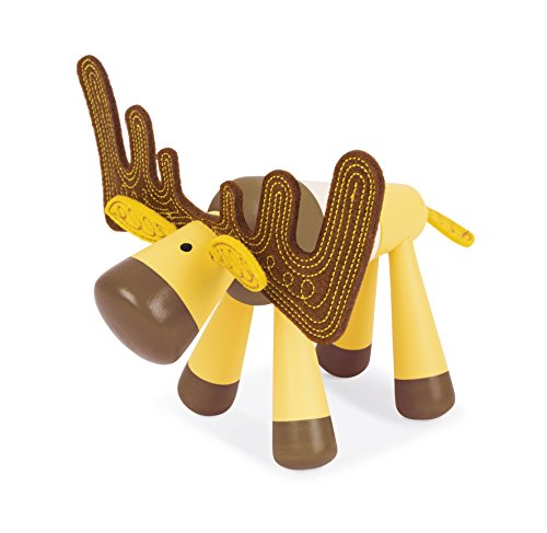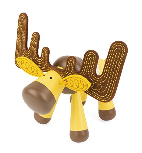 Janod Zigalos assembling Elk is a colorful and adorable wooden puzzle and play toy all-in-one. When assembled he holds firmly together and his head and legs twist. When you pull him apart he separates into 4 parts, the head, front legs, midsection and back legs. The ears, tail and antlers are all embroidered and made of a thick felt. The mighty Elk stands 6in. Long by 4in. Tall, is brightly colored with non-toxic paint and made of a smooth, quality wood. Recommended for children 1 year of age and older.Feature