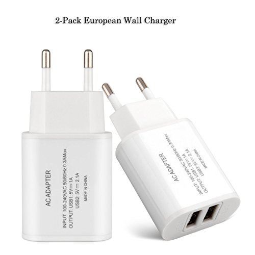 European Adapter, WITPRO 2-Pack 2.1A/5V Dual USB Port EU Travel Home Wall Charger Power Plug for iphone 7/6S Plus, Samsung Galaxy S7 S6 Edge, Note 4/5, HTC M9 10, LG G4 G5, Android Cell Phone
