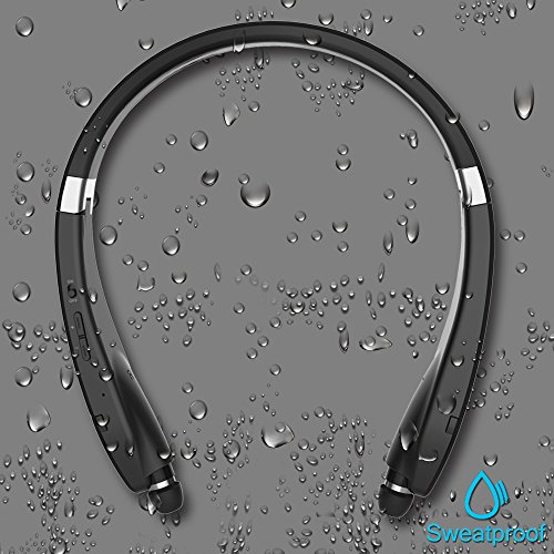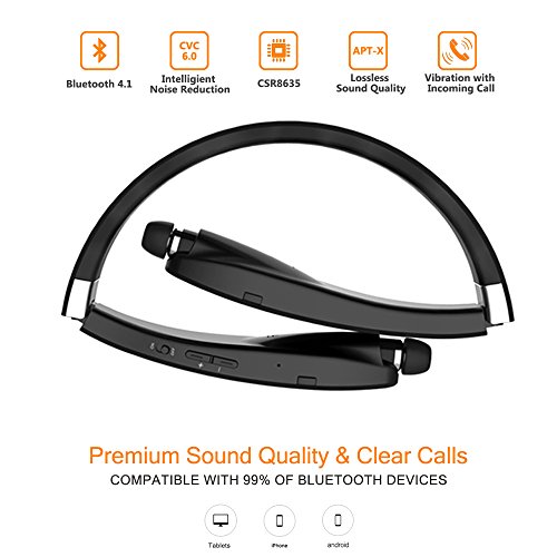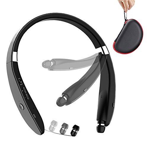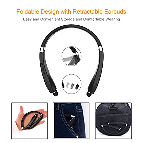 -. Feature : Neckband Designed, Around-the-Neck wearing design with perfect Body-Contoured fit. Made of environmental ABS+PC material, light and soft to wear comfortably, perfect for long time wearing no matter in outdoor activities or in office. / Unique Foldable and Retractable Design, Foldable design enables you to take it anywhere in your pocket or in your bag. Retractable Earbuds- a unique design for cable management, no more tangled wire obsession. / Advanced Bluetooth 4.1+CVC 6.0, latest Bluetooth 4.1chip provides fast, stable and low-power connection. These headphones are compatible with most smart phones, iPhone, Android devices and other Bluetooth Enabled Devices. / High-fidelity Stereo Sound Quality, built-in high sensitivity microphone and noise canceling technology, ensure crystal high quality sound no mater you are calling or listening to music. / Outstanding Battery Performance, The portable designed headphone built with large capacity battery, which provides up to 16 hours of continuous music time and 300 hours of standby with a single charge.