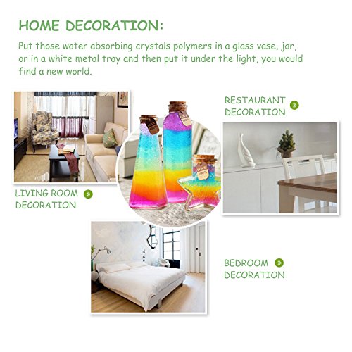 IDEAL DECORATION: Put those water absorbing crystal polymers in a glass vase, jar, or bottle then put it under a light, you would find a new beautiful world. Great for wedding, home decoration, and general decorations.