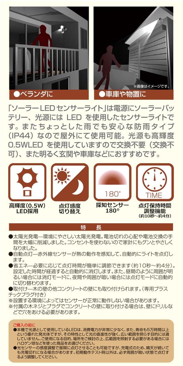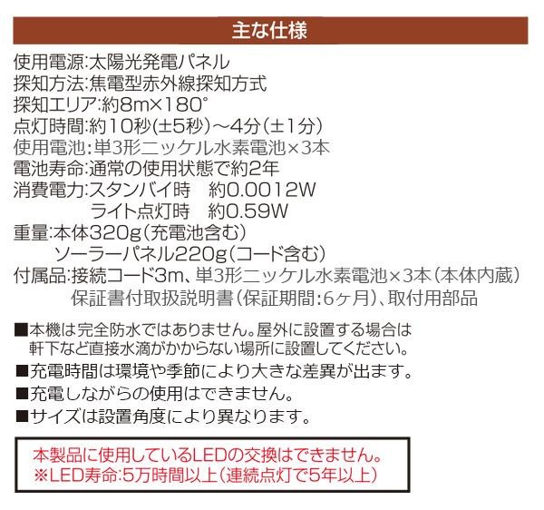 fk094igrjs環境に優しい太陽光発電のLEDセンサーライトです周囲の明るさと動きを感知して自動点灯、消灯します サイズ 本体:W110×D140×H200mm、ソーラーパネル:W100×D160×H160mm 個装サイズ:19.7×12.5×17.4cm 重量 個装重量:775g 生産国 中国 コンセント不要のソーラーLEDセンサーライト 環境に優しい太陽光発電のLEDセンサーライトです周囲の明るさと動きを感知して自動点灯、消灯します