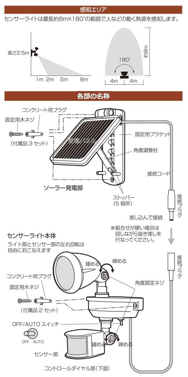 環境に優しい太陽光発電のLEDセンサーライトです。周囲の明るさと動きを感知して自動点灯、消灯します。