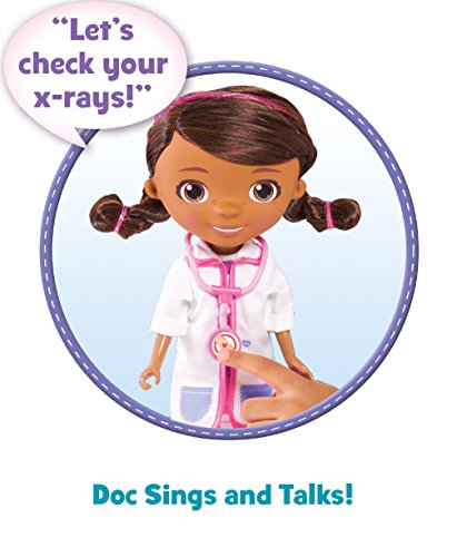 Studio : Just Play - Import Publisher : Just Play - Import Binding : Toy Product Description Doc McStuffins is now the Chief resident at the toy hospital where she takes care of toys from around the world on the hit Disney Junior preschool series, Doc McStuffins. Kids can reenact Doc McStuffins' hospital rounds with the magic talking Doc care cart set and help Doc take care of Find! Doc is an adorable 11.5" doll that talks and sings the toy hospital song when her stethoscope is pressed. Kids can help Doc roll the exam cart from patient to patient. The cart features light up x-rays, a fold-down bed, a storage drawer and a measuring tool for checking patients' height. The set includes: one Doc doll, one Find, two x-rays, two toy Doctor tools and a clipboard accessory. For ages 3 . 0