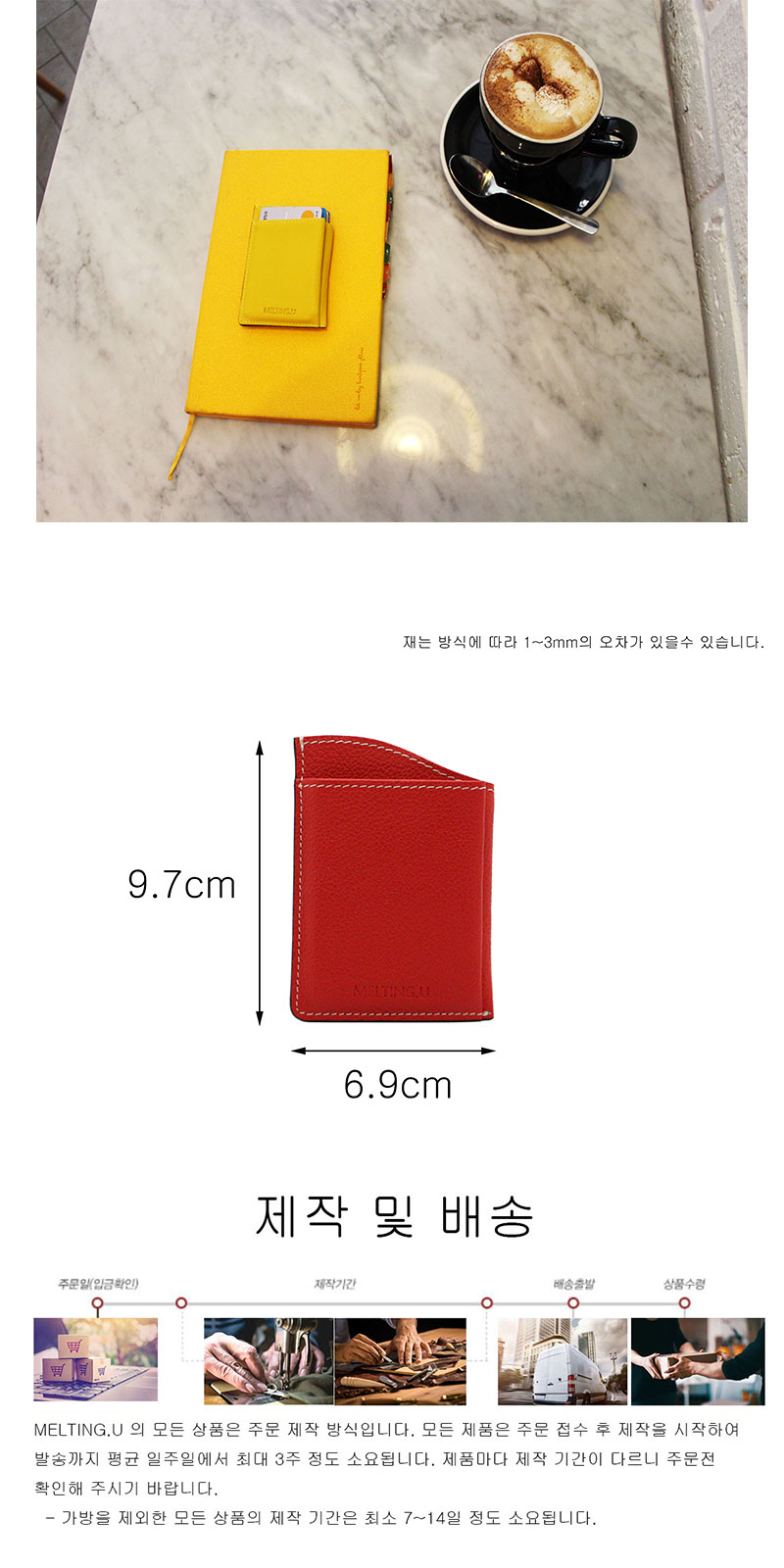 멜팅유의 모든 제품은 주문 접수 후 제작을 시작하며, 주문하신 순서대로 제작이 진행됩니다. 제품 별로 제작 기간이 명시돼 있으니 반드시 확인해 주시기 바랍니다. (평균 5~7 일의 시간이 소요됨) 급하게 필요하신 분들은 연락 주시면 최대한 맞춰드릴 수 있도록 노력하겠습니다.