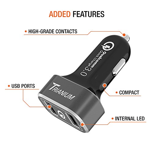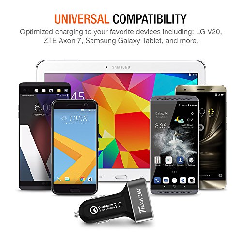-. Feature : Qualcomm Quick Charge 3.0 Technology reduces charging time by over 70% and allows for a powerful charge. (Notes: All QC 3.0 compatible devices are back-charge compatible with QC 2.0. And Quick Charge ability is limited to products with Qualcomm Quick Charge Technology.) / Features two Quick Charge 3.0 ports that provide up to 18W (12V/1.5A 9V/2A 5V/2A) of charging power and non-QC 3.0 devices up to 5V/2A. Additionally, a built-in blue LED light indicator (up top) helps to signify charger is ready to use. / Certified safety protects your devices against excessive current, overheating and overcharging. Made with a heavy-duty aluminum frame made to last. Lightweight, and extremely portable, fits in any compact socket space, and can be easily carried in a pocket, purse or suitcase. / Simultaneously smart ports charge two devices at once; compatible with all USB powered devices including Android,Samsung,HTC,Motorola, Google Nexus, Pixel smartphone and Apple products. Popular QC 3.0 Devices - LG V20, LG G5, ZTE Axon 7, Asus Zenfone 3 Deluxe, HTC 10 11, HTC One A9, HP Elite X3, Galaxy S8 / s8 Plus / Note 8 and more. / Comes with Trianium Dual Port QC 3.0 charger, user manual, our hassle-free 12-months warranty and friendly customer service.