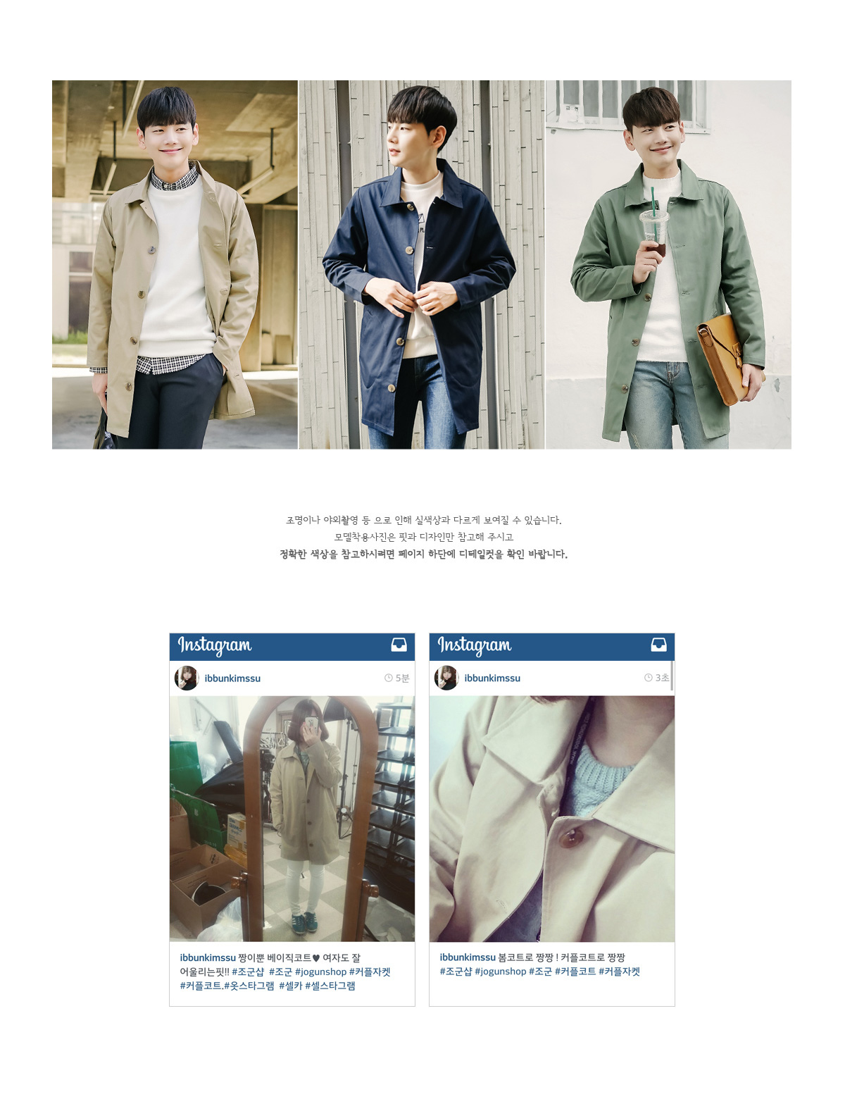기본 3가지의 워싱이 들어간 컬러로 준비되어 있으며 적당한 두께감으로 간편하게 이용할 수 있는 베이직 코트이다.