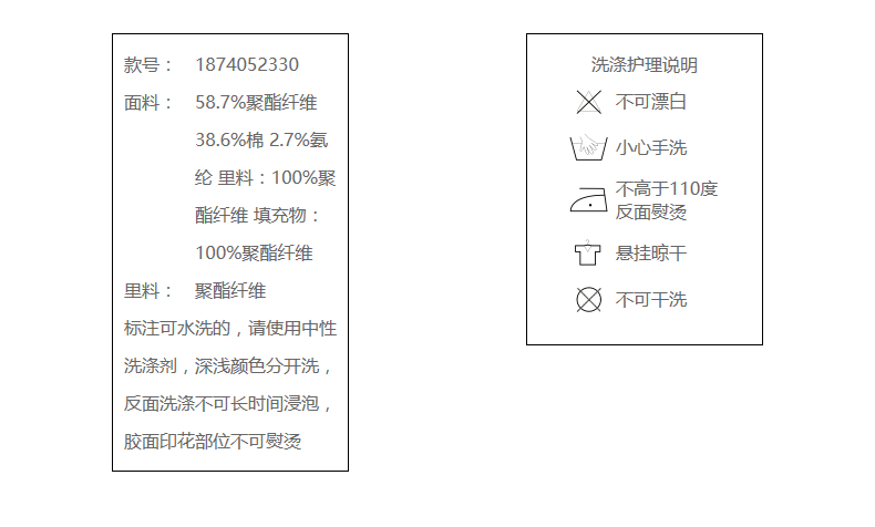 58.7%聚酯纤维 38.6%棉 2.7%氨纶 里料:100%聚酯纤维 填充物:100%聚酯纤维