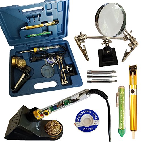 Whatnot Widgets 12 Piece Electronic Soldering Iron Kit with Adjustable Temperature 110V Electric 30-50 Watt Iron, 3 Tips, Helping Hands, Stand, Solder, Sucker, Wick, Tip Cleaner and holder, Tool Case