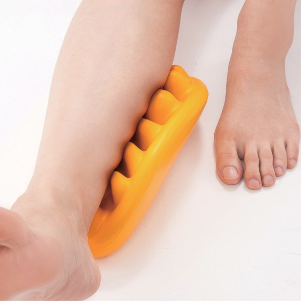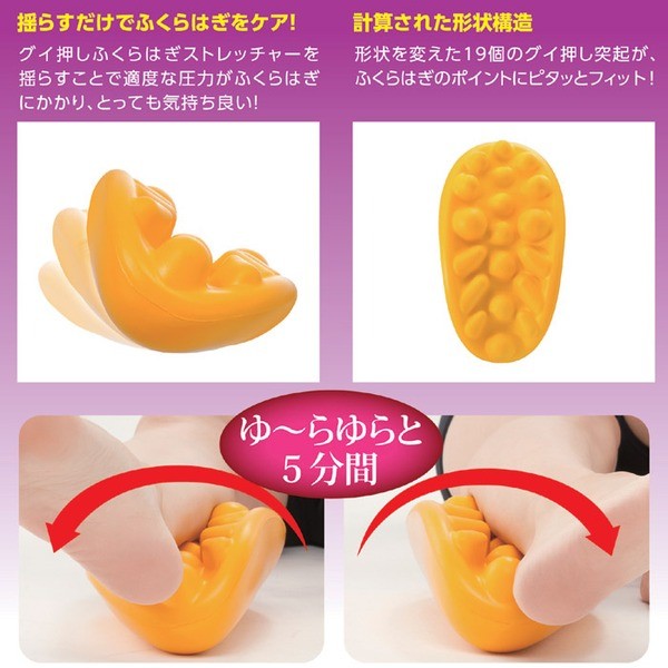 立ち仕事や家事などでパンパンになったふくらはぎをケアする新感覚グッズです。大小19個の独自設計突起にふくらはぎを乗せて、左右にゆらゆらと揺らすだけです。弾力のある突起部が、まるで指で押してもらっているような感覚でスッキリします。一日の終わりに約5分間程度ストレッチすることで身体も気分もリフレッシュしてください。