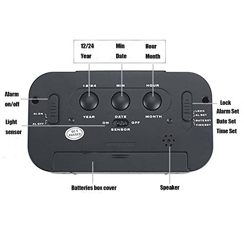 - Feature : Large 2 inch LED Display / Four Steps crescendo alarm, Ascending "beeping" alarm for gentle wake; Snooze repeats every 5 minutes (Press the Snooze button) / Alarm Indicator.Appropriate use of sleep soft light, women and children, elders / Calendar, Temperature(F and C) functions / Requires 3 AAA Zinc-carbon batteries (Not INCLUDED)