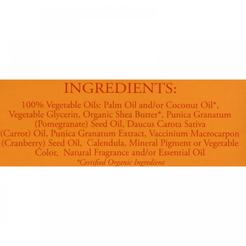 | Nubian Heritage Bar Soap Carrot And Pomegranate Description: Restorative, Revitalizing, Anti-Aging With Calendula Extract And Cranberries Organic Ingredients Nutrient-rich Carrot seed oils and ground pomegranate and cranberry seeds are blended into our Moisturizing, Carrot and Promegrannate Shea Butter based soap. Vitamins A, E and F, minerals, mositurizers and anti-inflammatory Calendula extract feed the skin, clear pores, improve skin tone and help rejuvenate mature and dull skin. Benefits: targets environmental stressors, restores and nourishes skin, stimulates cell renewal and deters premature wrinkles. Free Of Animal testing Disclaimer These statements have not been evaluated by the FDA. These products are not intended to diagnose, treat, cure, or prevent any disease.Size : 5 OZ Pack of : 1 Product Selling Unit : each |