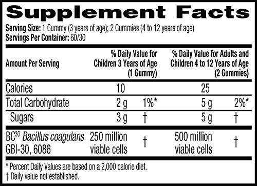 -. Feature : Daily Probiotic that supports everyday digestive and overall health / Delicious natural fruit-flavored gummies with no artificial flavors / Helps lessen minor abdominal discomfort, bloating, and may help relieve occasional diarrhea / BC30, the probiotic in Digestive Advantage, survives stomach acid 100x better than leading probiotics and yogurts / For Adults and Kids 3 years of age and older